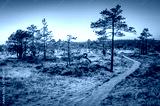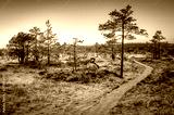 Wooden path through marsh covered with snow. Beautiful winter evening and cold frosty winter sunset. Selective focus. Kakerdaja nature trail. Estonia.