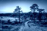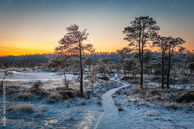 Wooden path through marsh covered with snow. Beautiful winter evening and cold frosty winter sunset. Selective focus. Kakerdaja nature trail. Estonia.