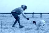 Smiling young African-American man hipster in sport hoody playing with his dog on the beach at sunny day