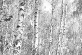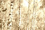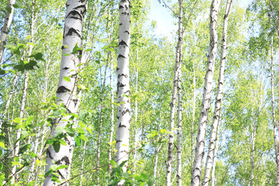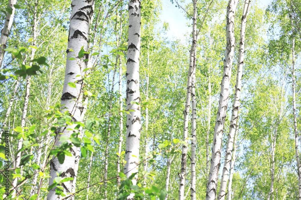 Beautiful birch trees with white birch bark in birch grove with green birch leaves in summer