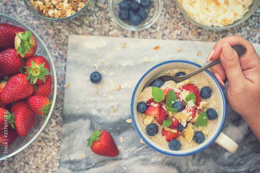 Young women eating oatmeal porridge with banana,coconut and fresh berry fruits for the breakfast