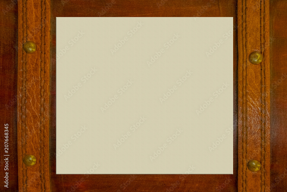 Wooden surface with leather straps an brass nails with paper space for copy in middle