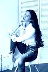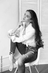 Sexy beautiful girl in jeans white shirt sitting on a chair. Gorgeous long hair and charming eyes young woman. Sexy Business lady is young and confident. Girl sitting on chair at home, naked body