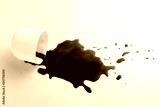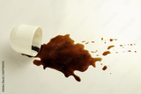 White cup and spilled black coffee on a white background