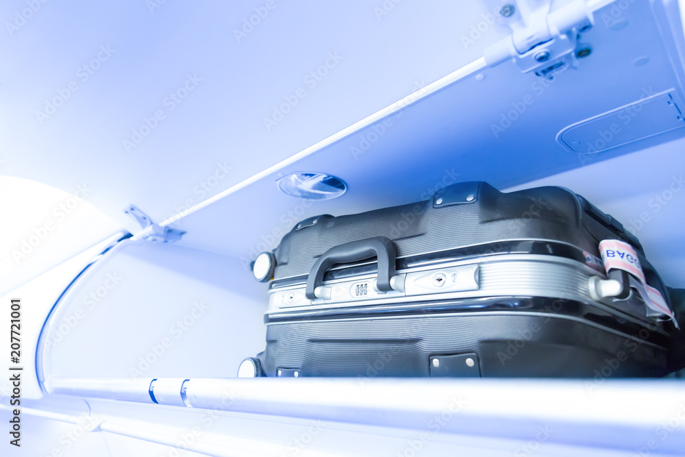 Luggage shelf with luggage suitcase in an airplane. Aircraft interior. Travel concept.
