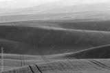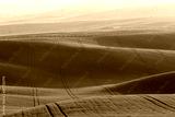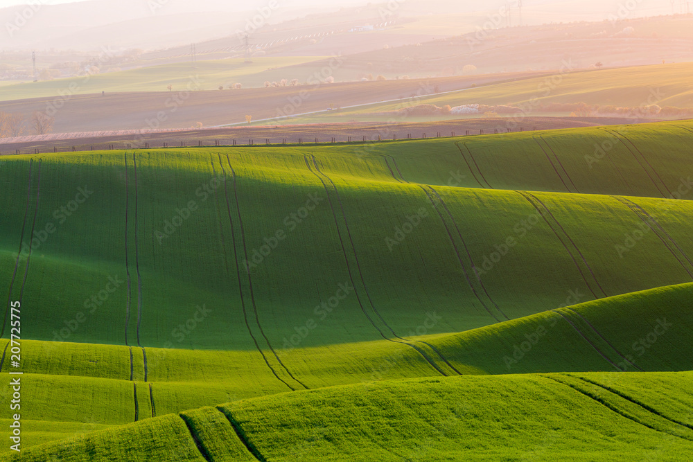 Rural spring agriculture texture background. Green waves hills in South Moravia, Czech Republic during sunset. Green fields landscape.