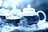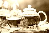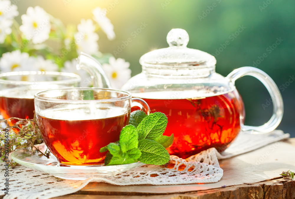 Cup with hot tea with mint and a thyme on a wooden table in a summer garden.