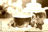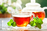 Cup with hot tea with mint and a thyme on a wooden table in a summer garden. Selective focus,