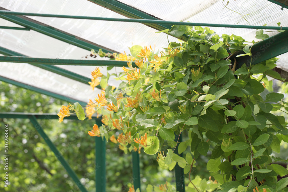 Lonicera caprifolium is a beautiful winding liana for vertical garden gardening. Yellow fragrant flowers.