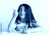 Happy child girl eating ice cream in white and chocolate bowl on white background. Enjoying delicious.