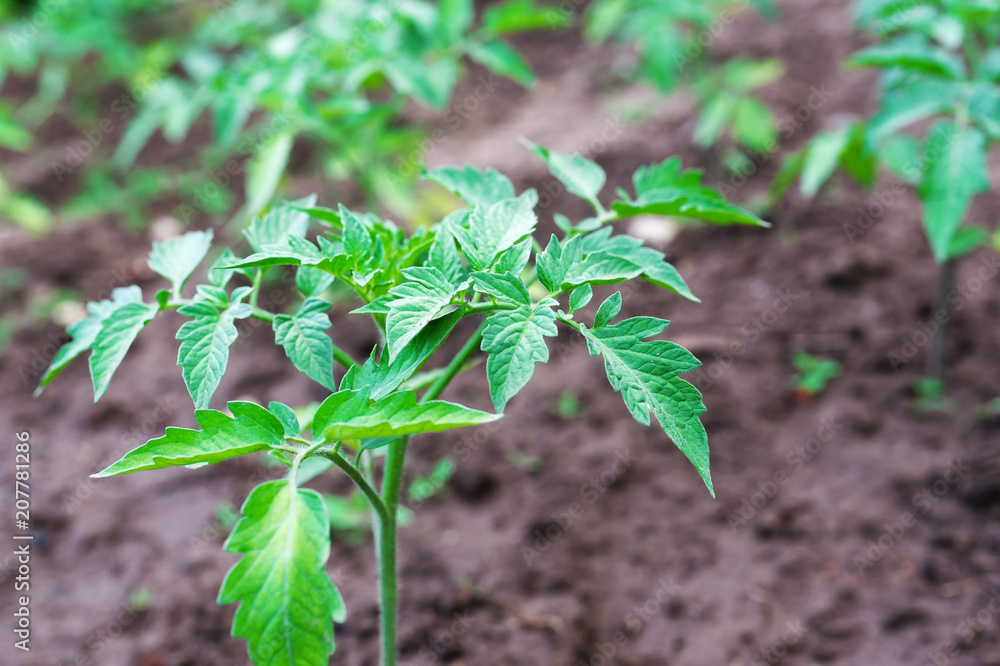 Young tomato plants in open ground in vegetable garden. Growing tomato in kitchen-garden. Horizontal orientation