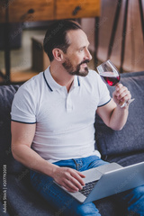 man using laptop and drinkingwine