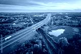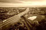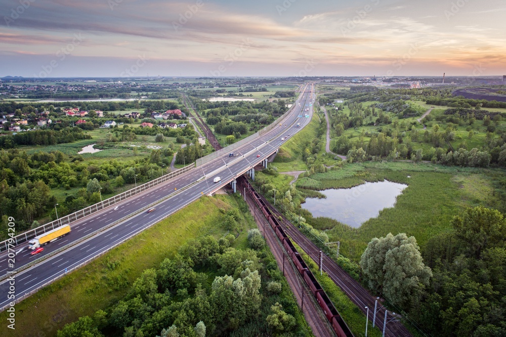 Aerial view on cargo train and motorway.