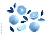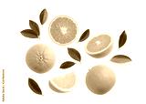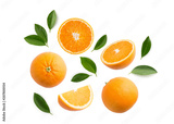 Group of slices, whole of fresh orange fruits and leaves isolated on white background. Top view