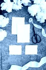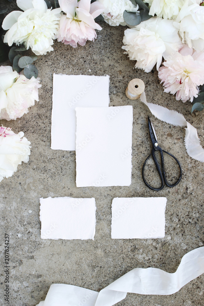 Feminine vertical wedding, birthday mock-up scene. Blank craft paper greeting cards, Eucalyptus, peony flowers flowers, vintage scissors and silk ribbon. Grunge concrete background. Flat lay, top view
