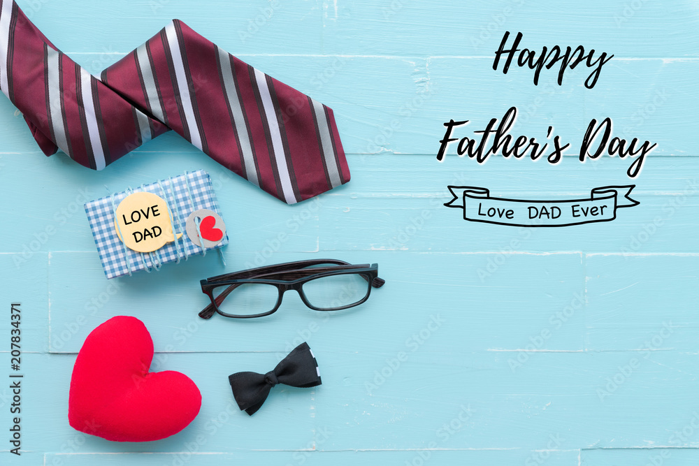 Happy fathers day concept. Red tie, glasses, gift box with LOVE DAD text and handmade red heart on bright blue pastel wooden table background.