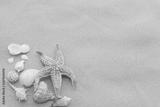 Group of beautiful seashell and starfish on Sandy beach background background for summer holiday and vacation concept.