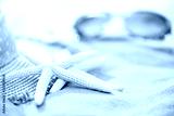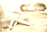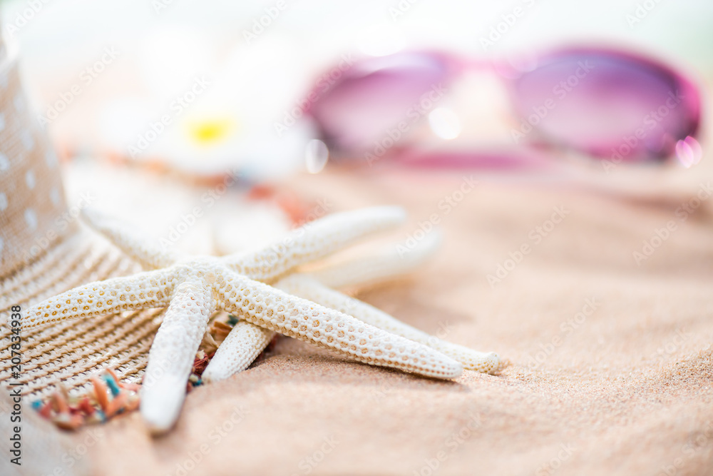 Beach accessories including sunglasses, starfish, flower and hat beach on Sandy beach background background for summer holiday and vacation concept.