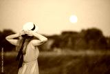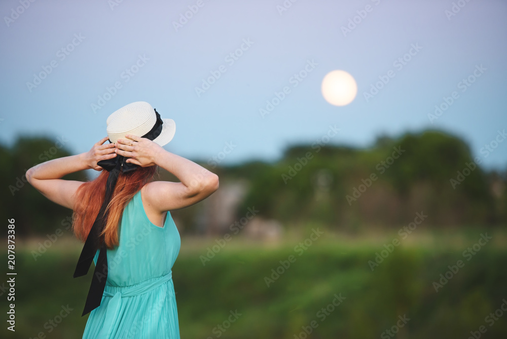 Girl with red hair in a blue dress and a hat watching the moon rise-lifestyle concept