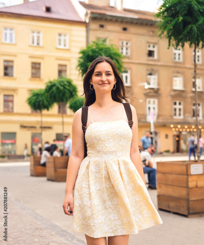 Young woman on an excursion in old city. Girl in yellow summer dress