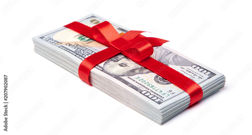 Concept, money as gift, win or bonus. Pile of 100 dollar bills is tied with red ribbon with bow. Isolated on white background.