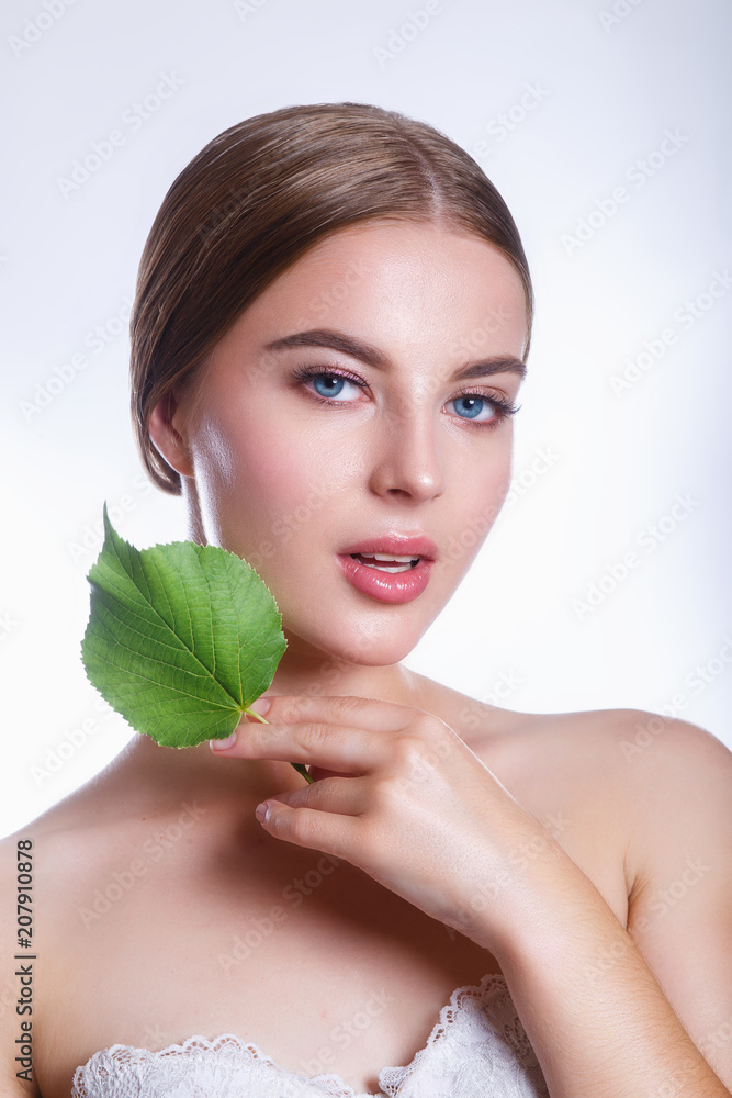 Beautiful woman face portrait with green leaf concept for skin care or organic cosmetics. Studio portrait