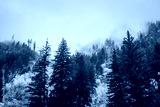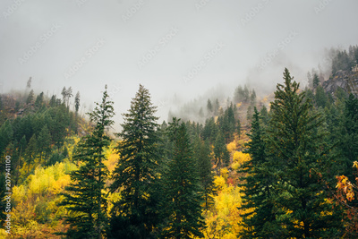 Pines in the foggy autumn forest