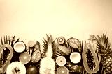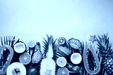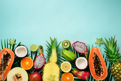Exotic fruits and tropical palm leaves on pastel turquoise background - papaya, mango, pineapple, banana, carambola, dragon fruit, kiwi, lemon, orange, melon, coconut, lime. Top view.