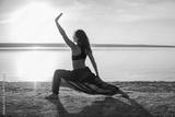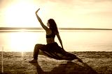 Silhouette woman on the beach at sunset doing yoga asana. Morning natural stretch warm-up training