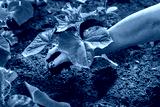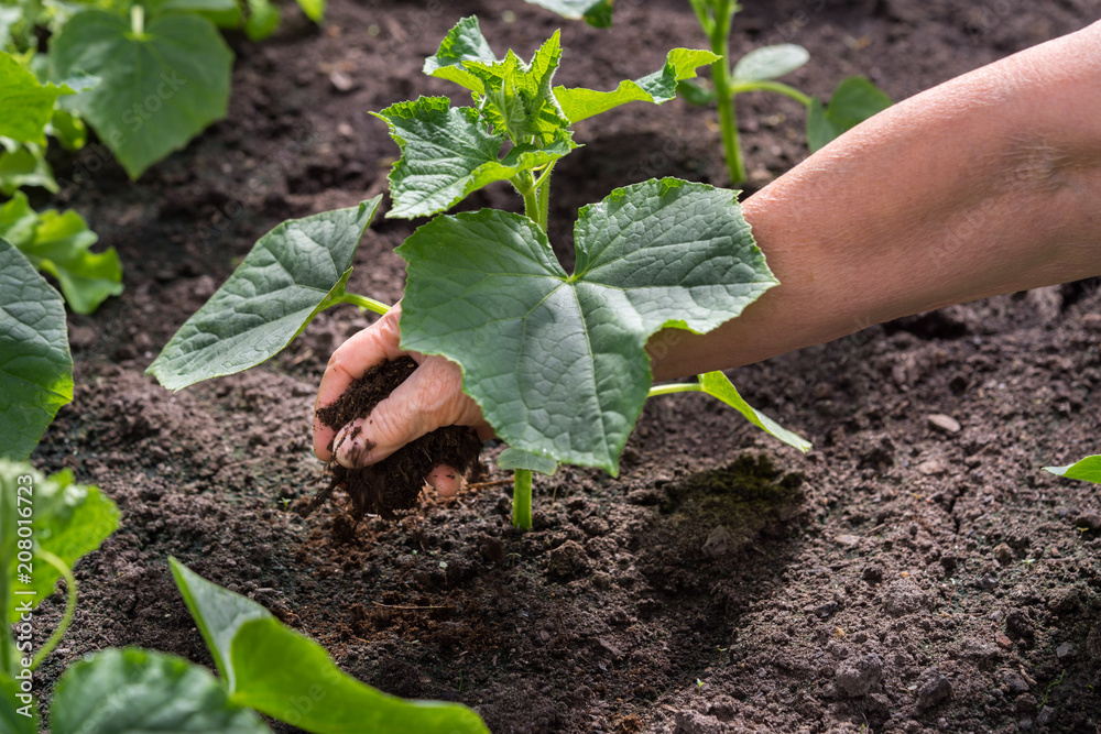 hand of a farmer giving dry horse dung fertilizer to new green plant in soil