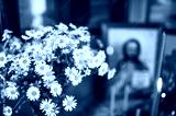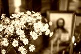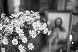 Beautiful bouquet of camomiles against the background of a sacred icon of Jesus Christ.