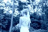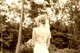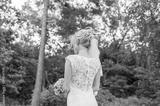 Young beautiful bride walk in green forest with bridal bouquet in white wedding dress