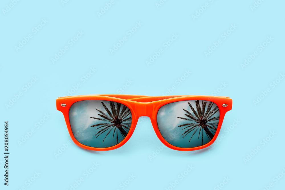 Summer concept image: orange sunglasses with palm tree reflections isolated in pastel blue background. Minimalist trend image ready for summer, sun protection, hot days and tropical travel vacation