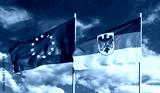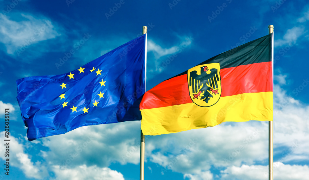 Flags of Germany (Federal Republic of Germany; in German: Bundesrepublik Deutschland) and European Union (EU) waving in the wind on bright sunny summer day and blue sky background. Vintage color tone.