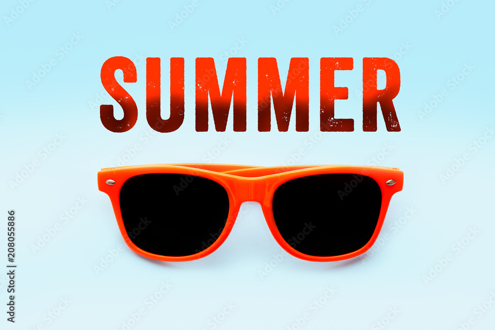 Summer orange text message and orange sunglasses isolated in light blue background. Minimal concept image for hot summer, sun protection, hot days, tropical travel, summer vacation holidays