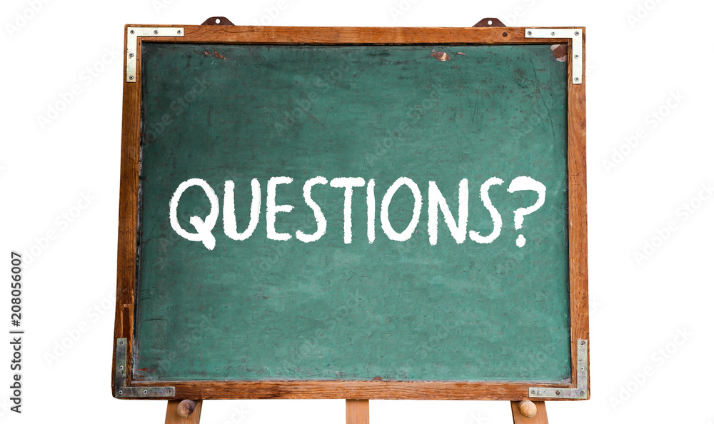 Questions? text word message in white chalk written on a green old grungy vintage wooden chalkboard or blackboard with frame and stand isolated on white background.