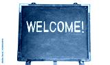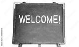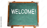 Welcome! text message in white chalk written on a school green old grungy vintage wooden chalkboard or blackboard with frame and stand isolated on white background.