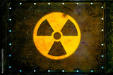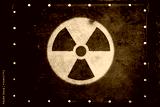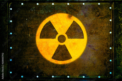 Round yellow radioactive (ionizing radiation) danger warning symbol painted on massive rusty metal plate fixed with metallic rivets to the wall with dark rusty brown and green moss.