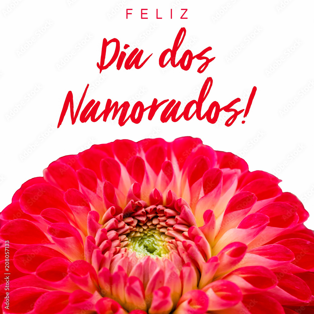 Feliz Dia dos Namorados! (text in Portuguese: Happy Valentine’s Day!) and red and pink dahlia flower isolated on a seamless white background. Concept image for valentines day holidays.