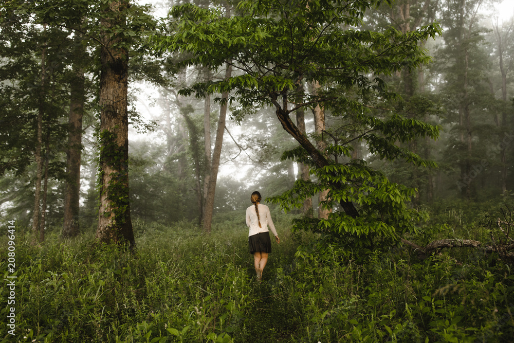 a woman walking through the woods in the morning