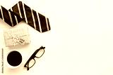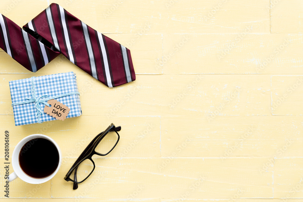 Happy fathers day concept. Red tie, glasses, gift box with mustache and coffee cup on bright yellow pastel wooden table background.