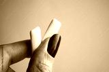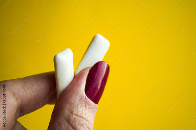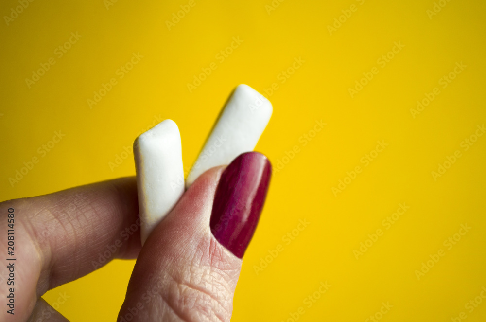 girl holding in hand chewing gum in the form of pads on a yellow background