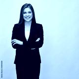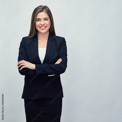 miling business woman wearing black suit standing with crossed a