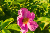 Dog rose pink flower in the bush on springtime.