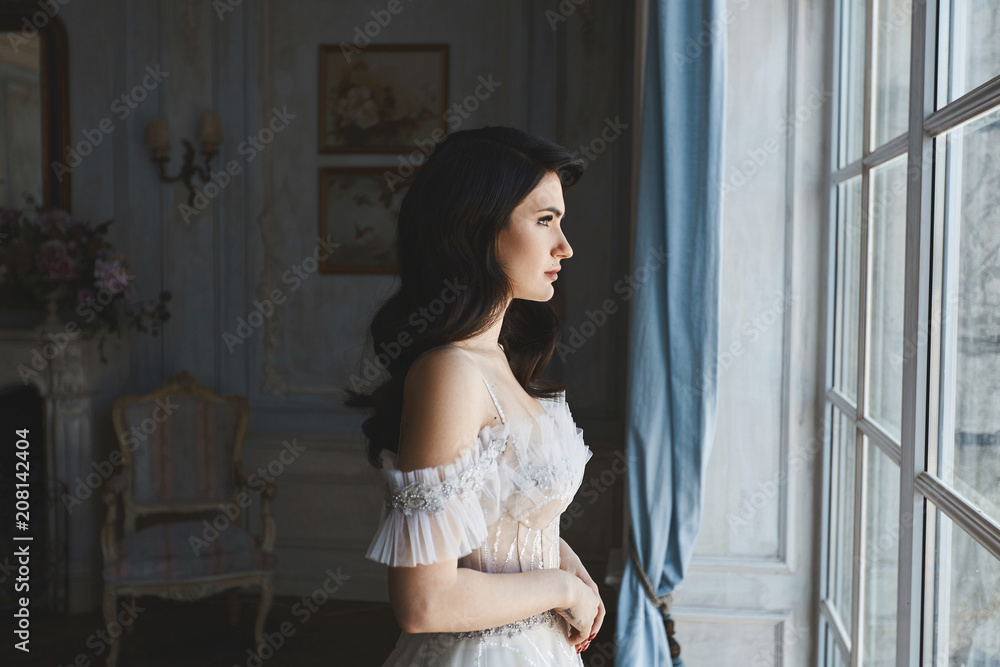Beautiful, sexy and sensual brunette model girl in stylish lace dress with naked shoulders posing in luxury vintage interior near the window