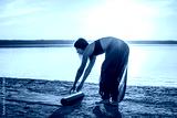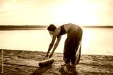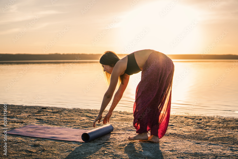 woman on the beach at sunset starts yoga training with yoga mat. Morning natural stretch warm-up training