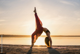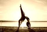 Silhouette woman on the beach at sunset doing yoga asana. Morning natural stretch warm-up training