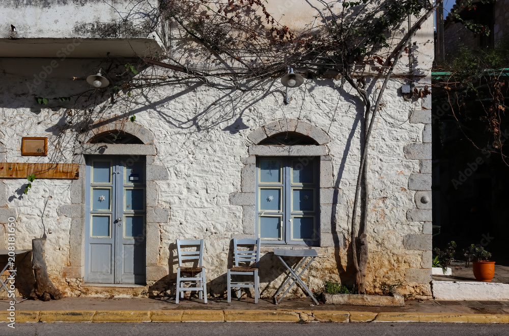 Front of small picturesque store or resturant with table and chairs on sidewalk closed for holiday on main street of small Greek town by the sea