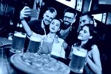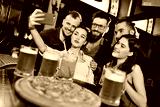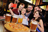 group or company of young people - friends drink beer, eat pizza, talk and laugh and shoot selfie on the smartphone's camera on the background of the bar