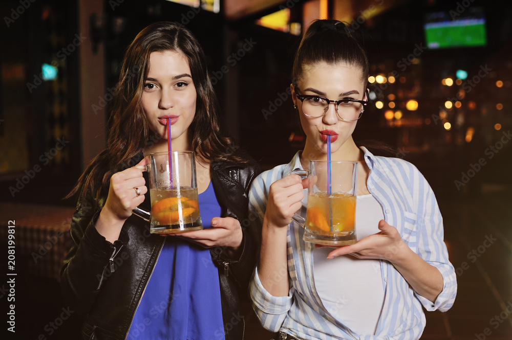two young cute seductive girls with a glass of beer or a beer cocktail on the background of the bar